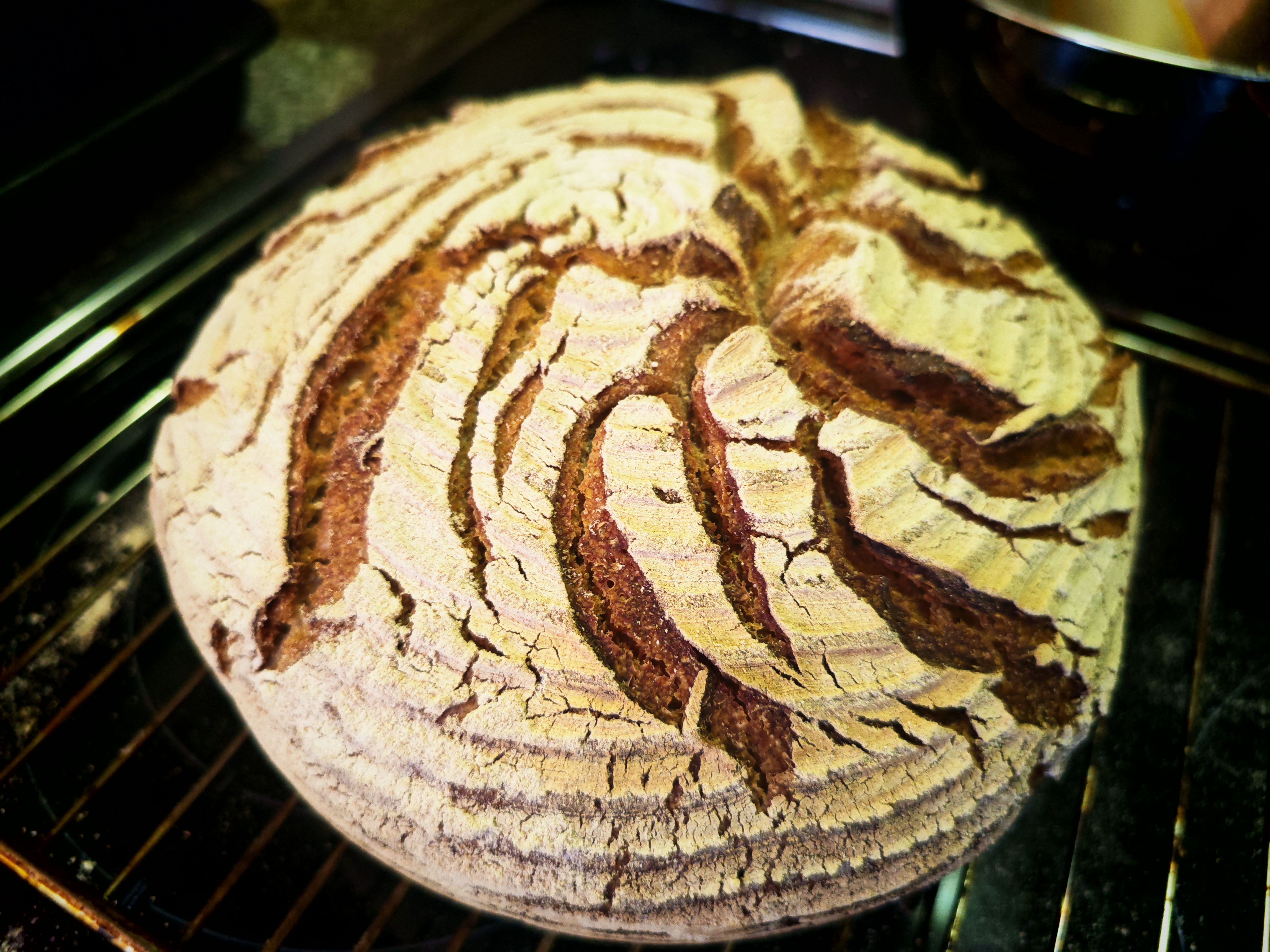 Roggenkruste gebacken, hierbei habe ich zwar zuerst das Wasser um 5% reduziert. Jedoch habe ich die zurückgehaltene Wassermenge nach 2 Minuten Knetzeit doch noch hinzugegeben. Das Wasser habe ich auch vergessen in warmer Form zu nehmen. 180 ml im Hauptteig waren normale Raumtemperatur die restlichen 60 ml habe ich dann auf ca. 50-60 Grad erwärmt.