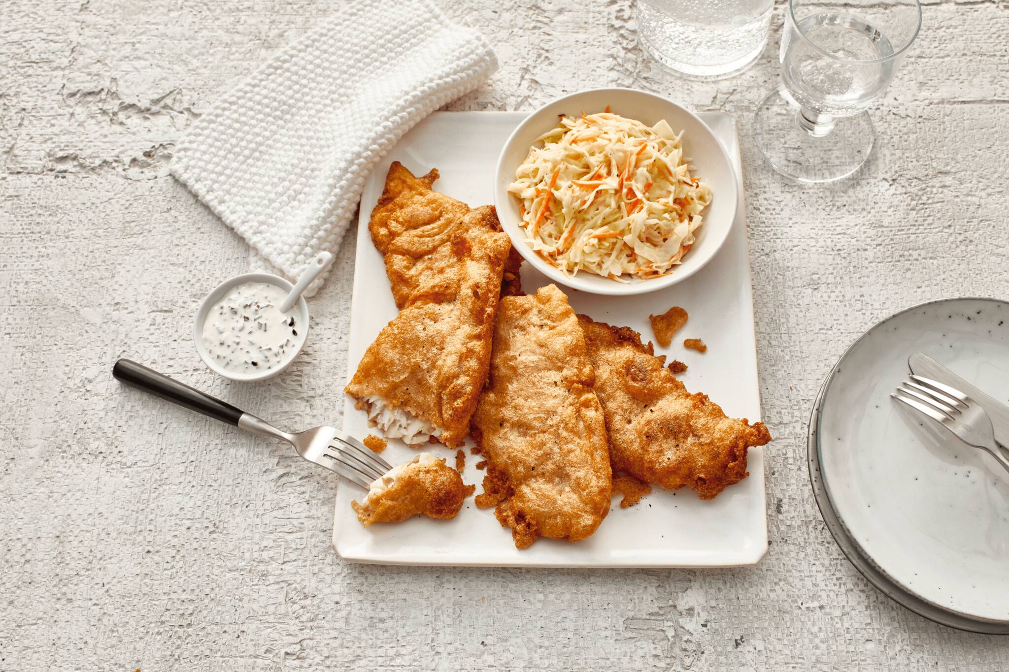 - Restliches Mehl in einen Teller geben und mit Pfeffer und Salz würzen. Frittierfett in einem Topf erhitzen. Fisch erst im Mehl wenden, in den Bierteig geben und anschließend 4-5 Minuten frittieren. Abtropfen lassen und mit Remoulade und Apfel-Coleslaw servieren.