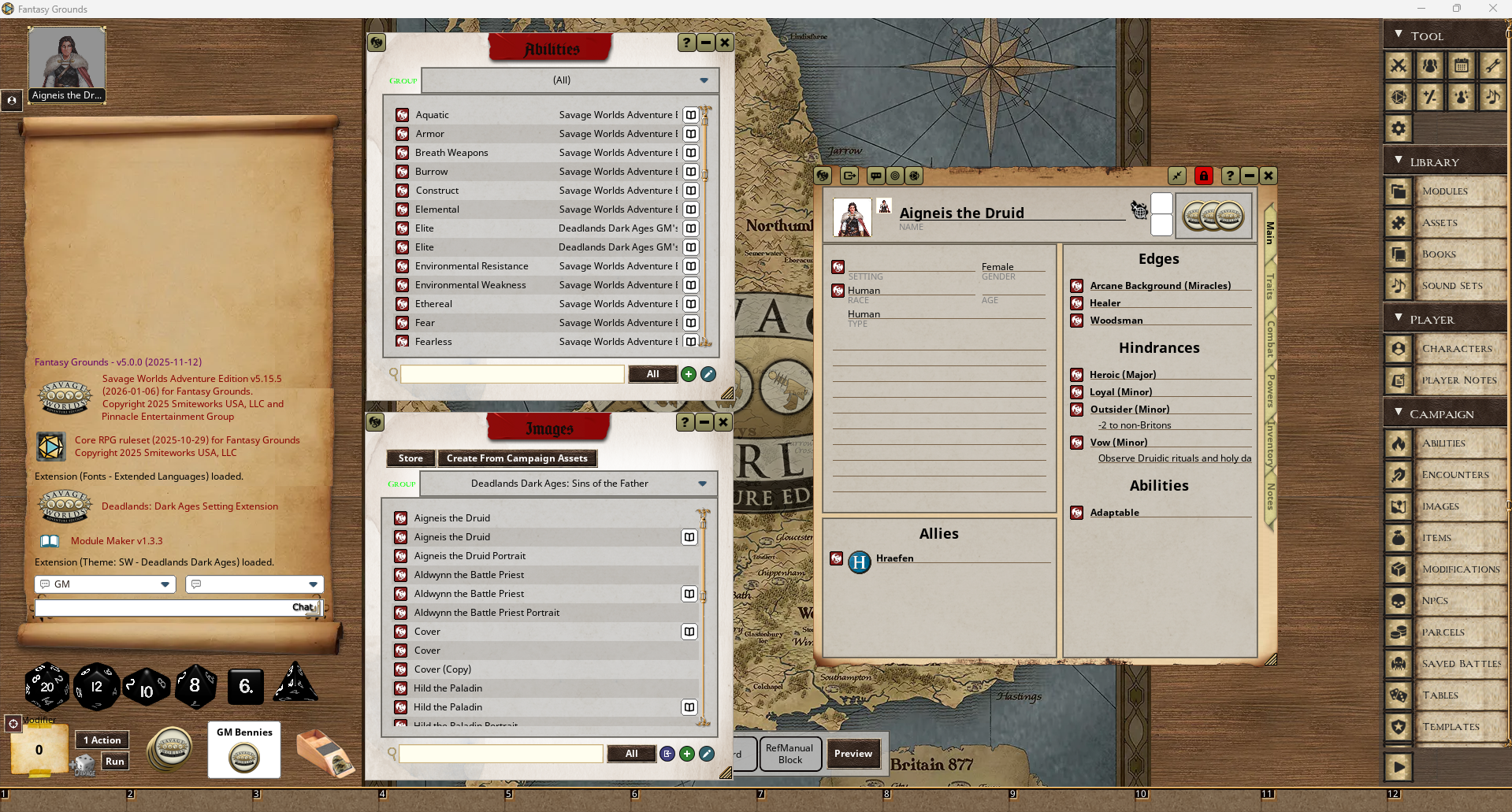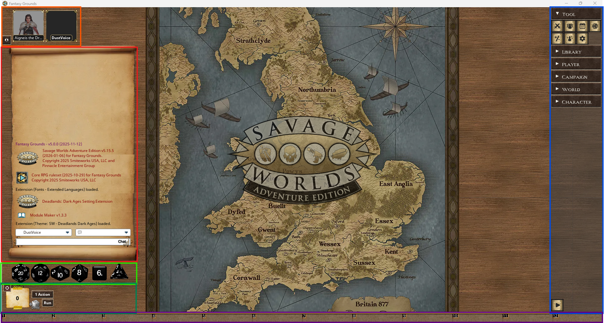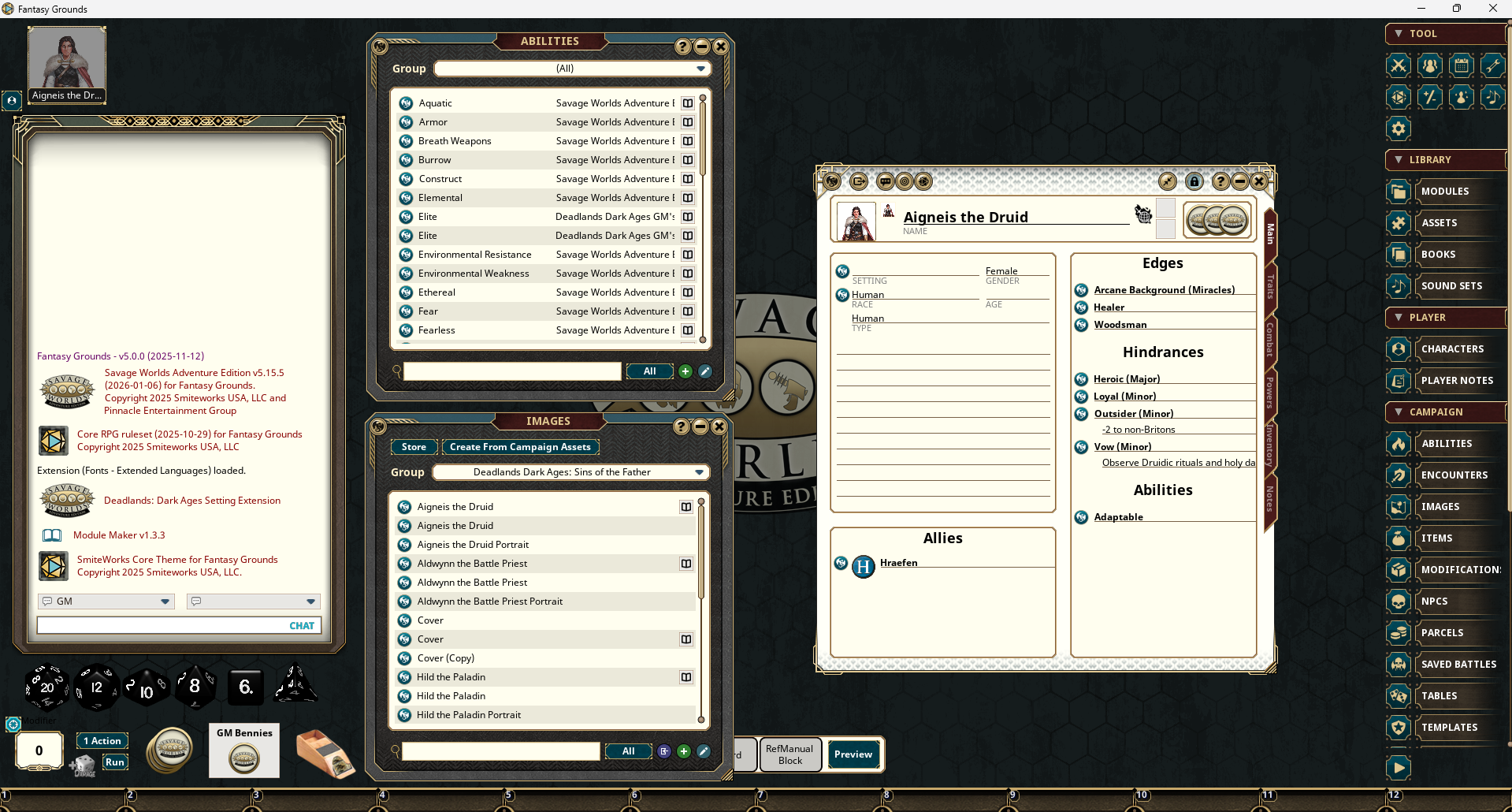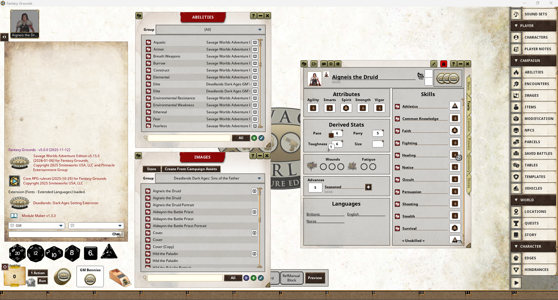The culprit is that albeit the following sections detailing the different aspects of a SWADE campaign, you can’t test this out yourself without owning the Savage Worlds (Adventure Edition) ruleset for FG, which (in contrast to the D&D 5e ruleset) is not included with FG and needs to be purchased seperately for around ten bucks.
