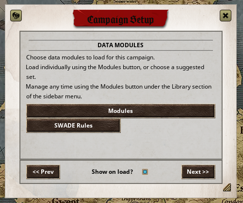 As the next page informs us, this is the moment you can load the included modules for the campaign. This is absolutely necessary or else you won’t be able to use said content. Your GM should be able to tell you exactly what to activate for a specific campaign. To proceed, click the Modules button.