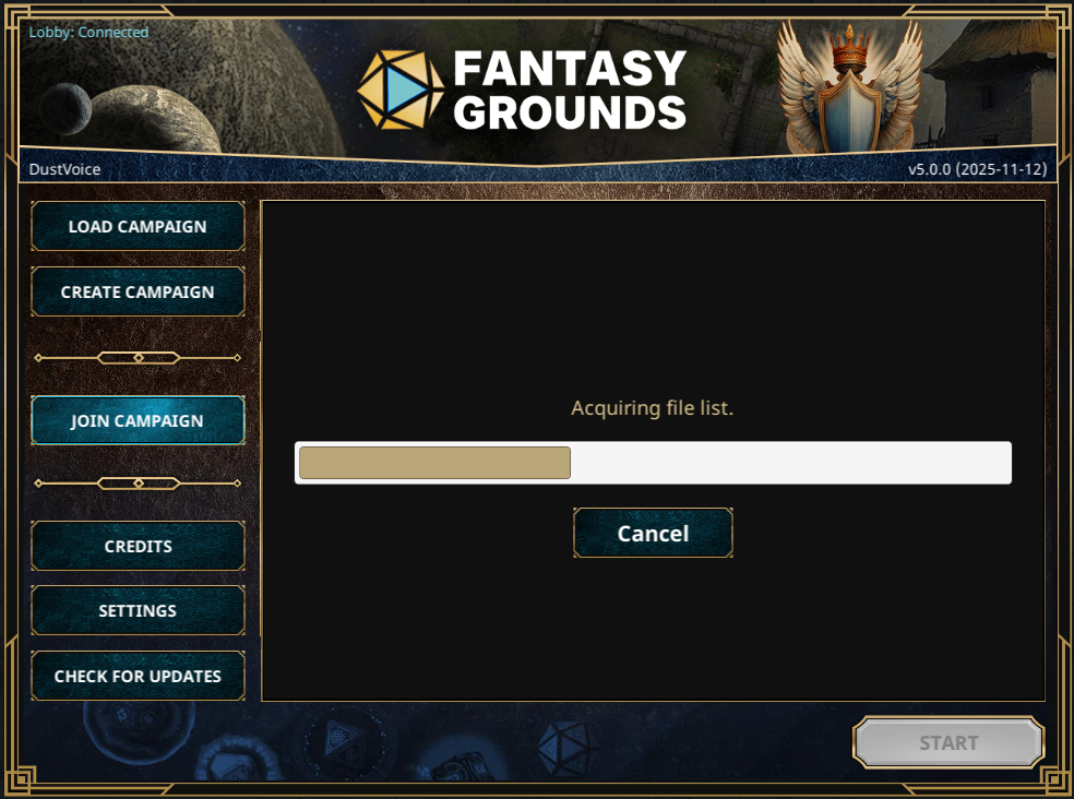 Click on Start. After clicking start, it will take a while depending on how much of the necessary content of the campaign you don’t own and therefore haven’t downloaded yet. Simply wait for everything to finish and for the campaign to load. This will be significantly sped up upon reconnects!