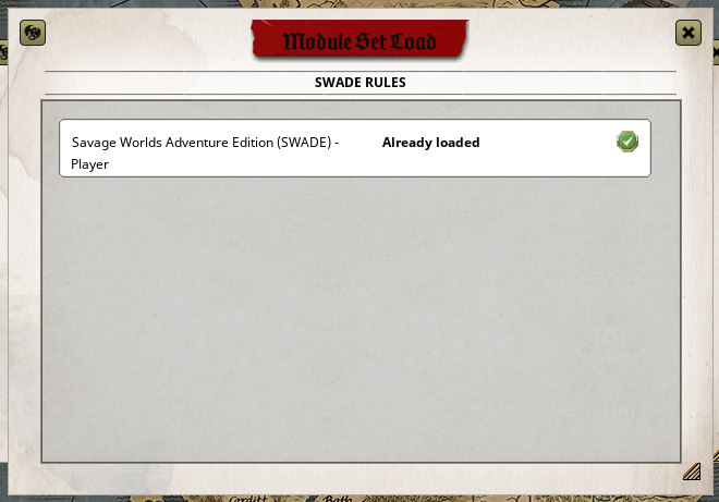 Clicking on SWADE Rules, make sure that every necessary ruleset is loaded indicated by a green checkmark. Again, ask your GM they’ll know. In this example I only have one ruleset, some SWADE settings however provide additional modules in this section.