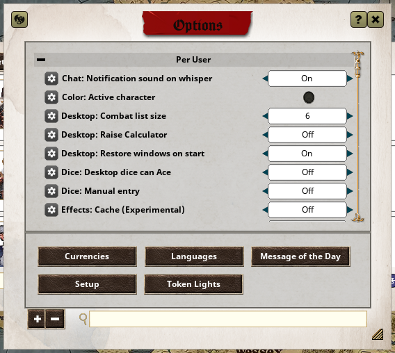 In the options you can change only some user-specific campaign settings. You can also recall the Setup window we’re discussing, if you ever need to open it again. None of these settings are necessary right now, though, so we will skip this part. If you, however, encounter any gripe or issue during the campaign, you might want to look if it’s a user setting and/or ask your GM. You can always access the settings menu later through the Cog icon under the Tool category in the sidebar.