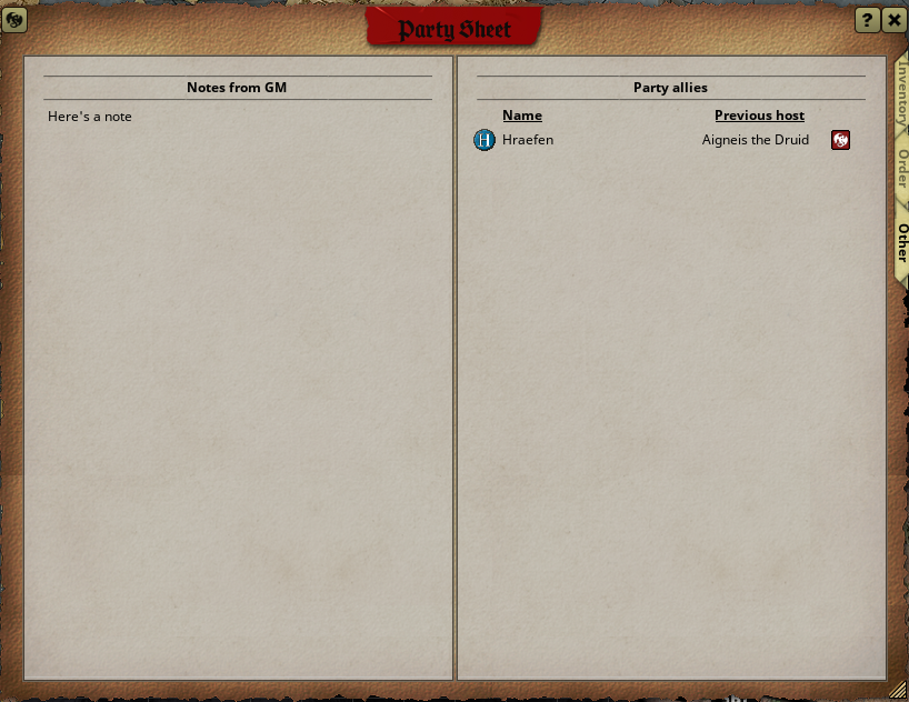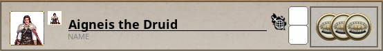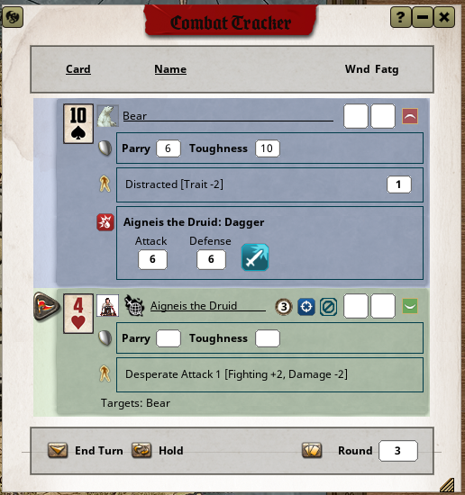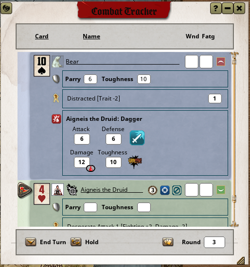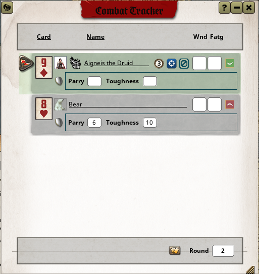 - Also Status of your character in terms of Wounds, Fatigue, Advances and Languages