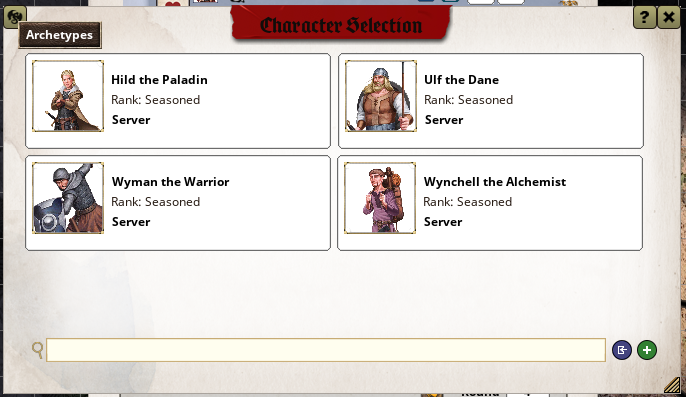 This window is used to select a character. You may either choose an available premade one, or create one using the green ”+” button. Selecting/Creating a character makes you the owner of it, which is required for a multitude of interactions.