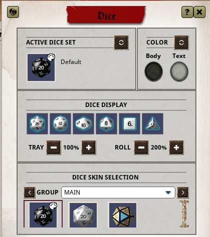 The only exception to the above are dice skins! These are on a per-player basis and can’t be shared. There are a handful of “default” dice available (with color customization), but especially dice with effects are a premium purchase for your account.