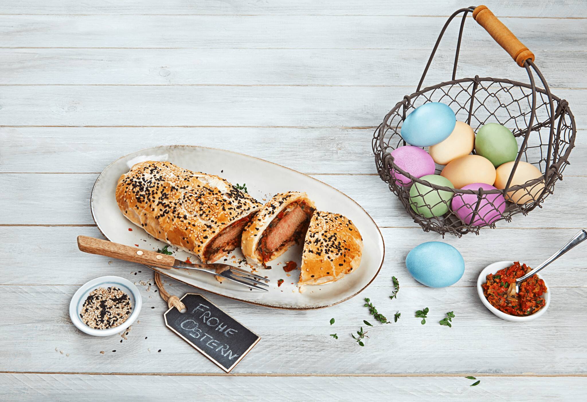 - Blätterteig auf der bemehlten Arbeitsfläche ausrollen und in 4 gleiche Teile schneiden. Blätterteig flächig mit Schinken belegen, 2 cm Rand lassen. Die Füllung darauf verteilen, Lammlachse darauflegen. Ei in einem Schüsselschen verquirlen und die Ränder des Blätterteigs mit dem Ei bestreichen. Blätterteig einschlagen, sodass die Lachse komplett bedeckt sind. Schnittstellen andrücken, Blätterteigrolle oben ebenfalls mit Ei bestreichen, mit Sesam bestreuen.
